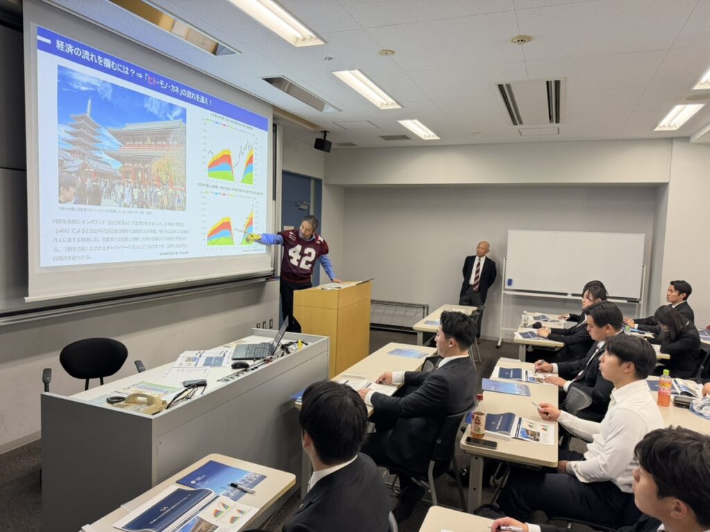 セミナーの一部では、当社チーフエコノミスト・マーケットストラテジストの松波俊哉による講義も行われました。日経新聞や経済ニュースの読み方を中心に、「経済の流れを掴むには『ヒト・モノ・カネ』の流れを追え」というテーマのもと、表面的な情報にとらわれず、事実とそれを裏付けるデータをもとに経済を読み解く視点について解説しました。