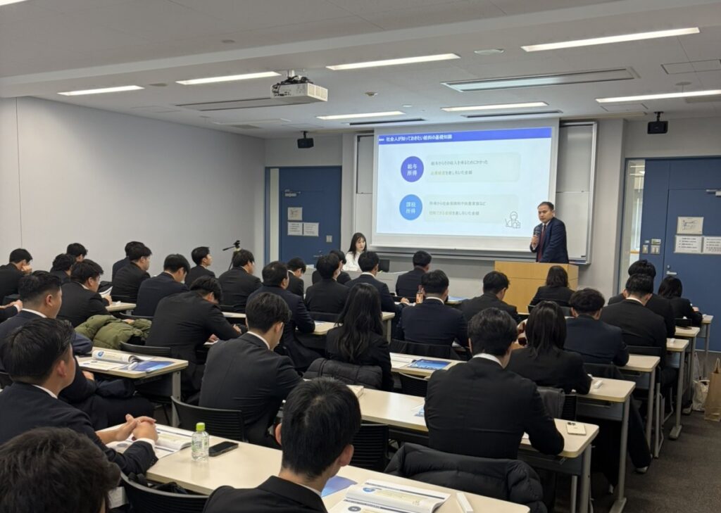 4年生向けセッションでは、社会人直前のタイミングに合わせ、給与・税金・社会制度の基本的な仕組みから、リスクを踏まえた意思決定の考え方、そして経済ニュースや日経新聞の読み方まで、社会人として必ず直面する金融知識を解説しました。