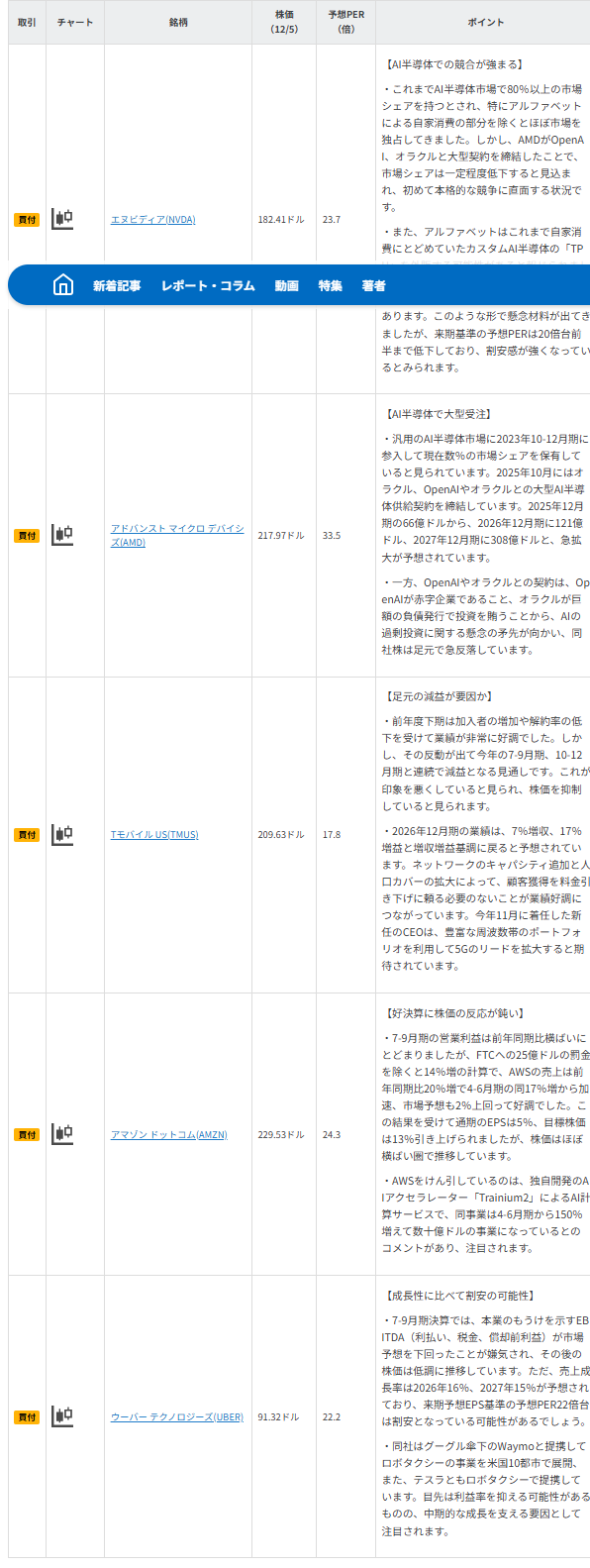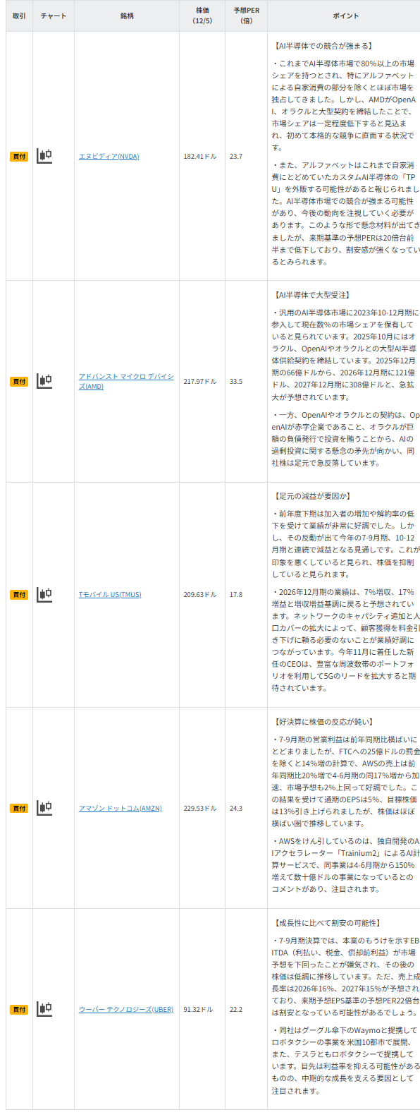 図表4 今週の5銘柄の投資指標