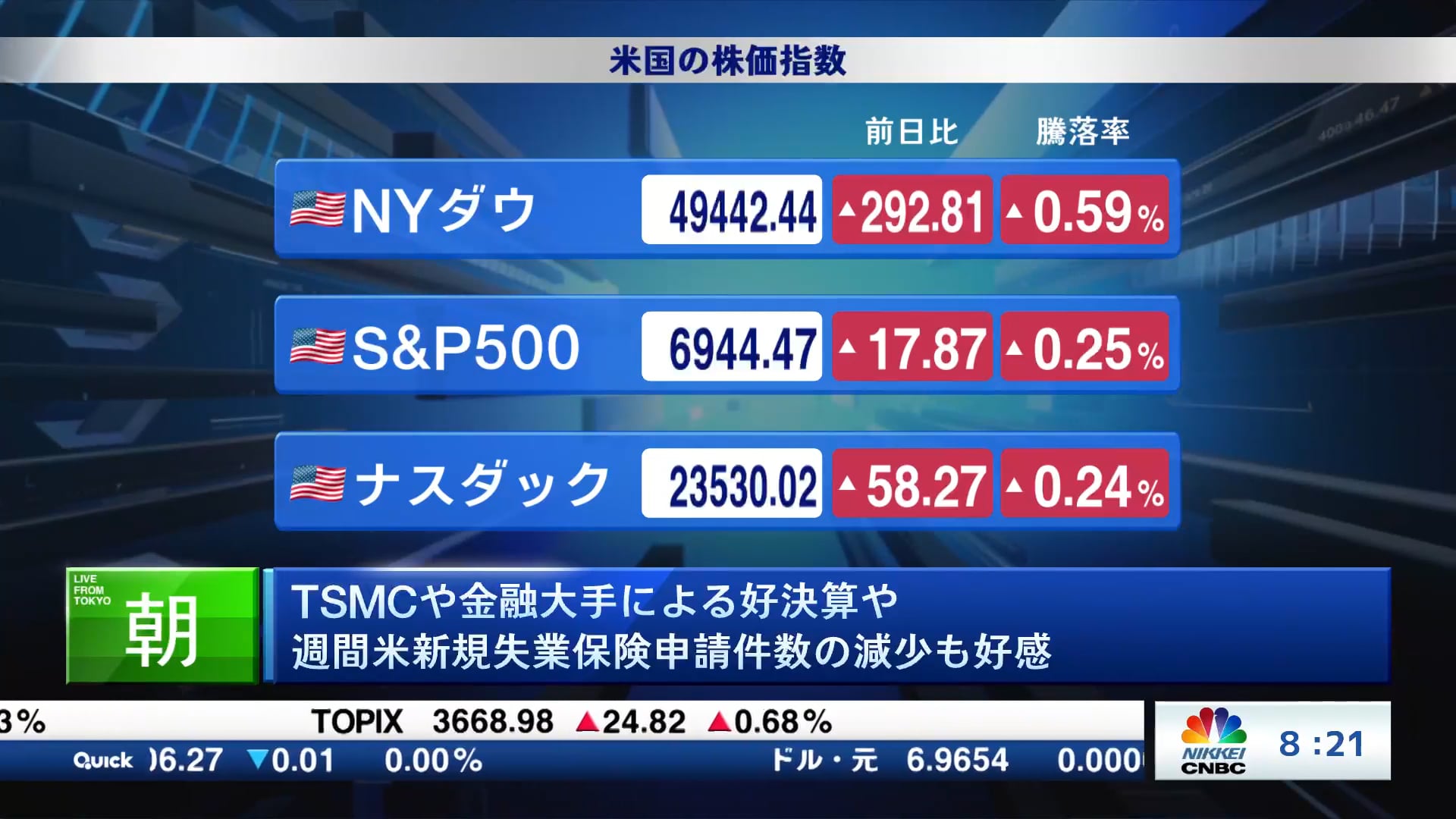 TSMCや金融大手による好決算や週間米新規失業保険申請件数の減少も好感